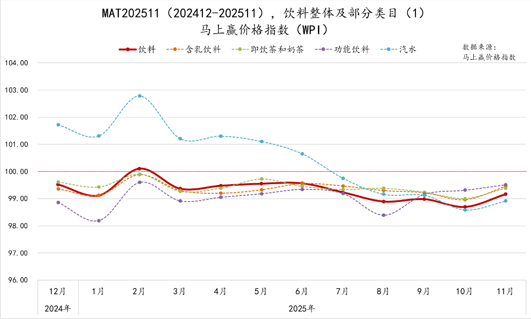 “旺季不旺”催动的价格战压力,成为行业短期核心困境。马上赢数据显示,2024年12月至2025年11月,软饮料行业整体价格持续承压,多数时段价格指数低于100基准线;2025年6月进入传统旺季后,价格下行压力加剧,直至11月旺季落幕才略有缓解。