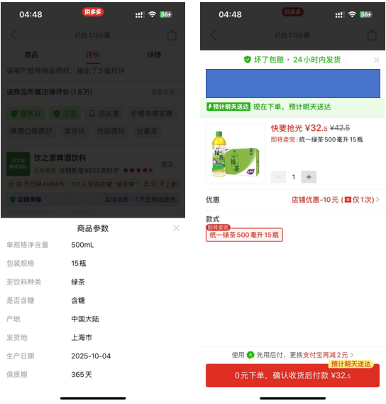 二是跨渠道价差悬殊,打乱价格体系。以500ml统一绿茶为例,零食折扣店售价2.3元,传统终端售价3元,美宜佳部分市场推出“3瓶6元”活动,拼多多10月新日期产品单瓶到手价低至2.18元。显著价差诱发破价与窜货行为,持续冲击市场秩序。