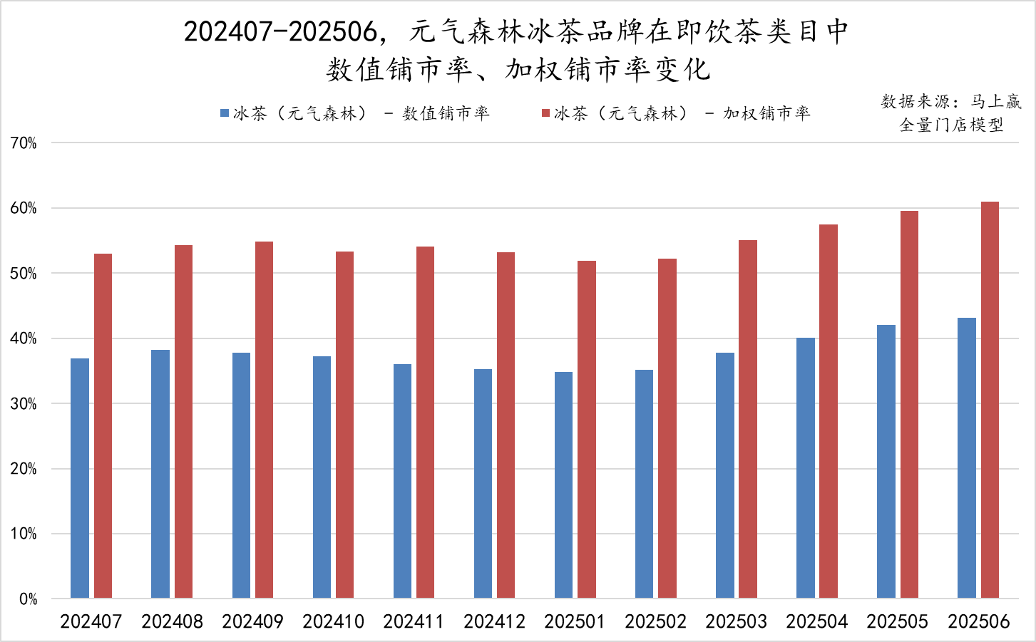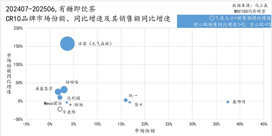 三是创新品类形态,打造差异化竞争优势。统一创新推出可乐味冰红茶,将气泡体验与传统冰茶融合;农夫山泉推出碳酸茶饮料,以气泡特质与传统冰茶形成差异;元气森林冰茶则凭借减糖配方与锁鲜技术,在传统冰红茶赛道建立优势。马上赢数据显示,2024年7月至2025年6月期间,元气森林市场份额同比增速保持在150%的高位。