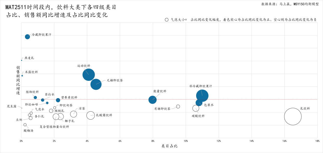 增长阵营中,无糖即饮茶、运动饮料等六类品类实现占比与销售额双增长。其中,冷藏即饮果汁销售额增速近50%,领跑全品类;无糖即饮茶延续强势增长态势。此外,包装水等六类品类销售额整体平稳、占比呈不同程度上升,而碳酸饮料、凉茶等传统品类则陷入占比与销售额同步萎缩的困境。