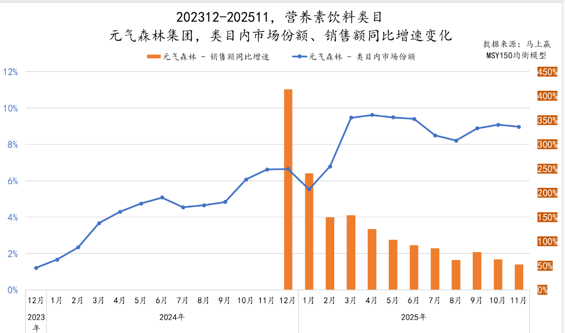 稳价举措成效显著。马上赢监测显示,元气森林的市场份额在2025年1—3月实现飞跃式提升,从6%跃升至10%,截至11月虽有小幅波动,但始终稳定在9%左右。