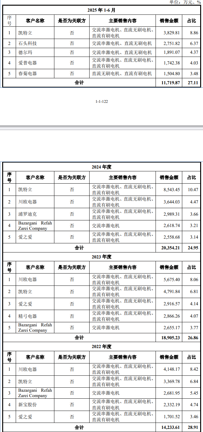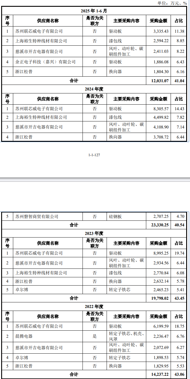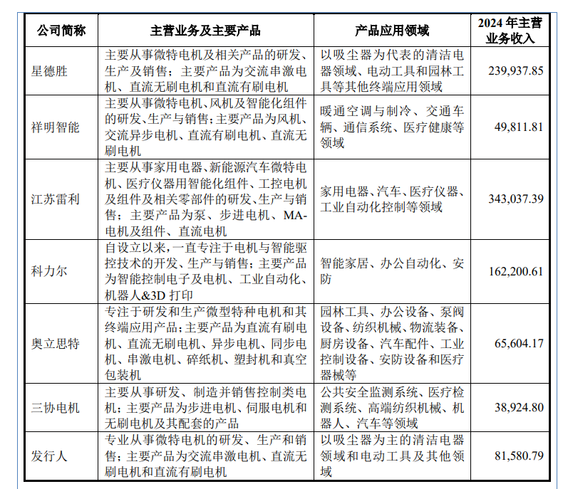 晨光电机专业从事微特电机的研发、生产和销售,产品主要应用于以吸尘器为主的清洁电器领域。报告期内(2022年至2025年上半年),晨光电机的营业收入分别为4.95亿元、7.12亿元、8.27亿元、4.37亿元;净利润分别为5827.28万元、9933.11万元、7862.6万元、4323.56万元。