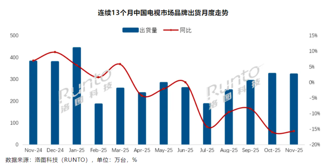 洛图科技数据显示,2025年11月电视市场品牌整机出货量约322万台,较去年同期下降15.7%,反映出AI家电的市场渗透仍处于缓慢推进阶段。
