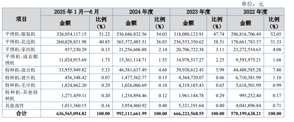 报告期内,公司平绣机收入占比90%左右,系公司收入主要来源,平绣机又以服装机和花边机两类机型为主,服装机与花边机合计收入占主营业务收入的比例超过80%且逐期增长,公司主要产品收入结构较为稳定。公司其他部件主要系附加装置、机架、台板等,占比较小。
