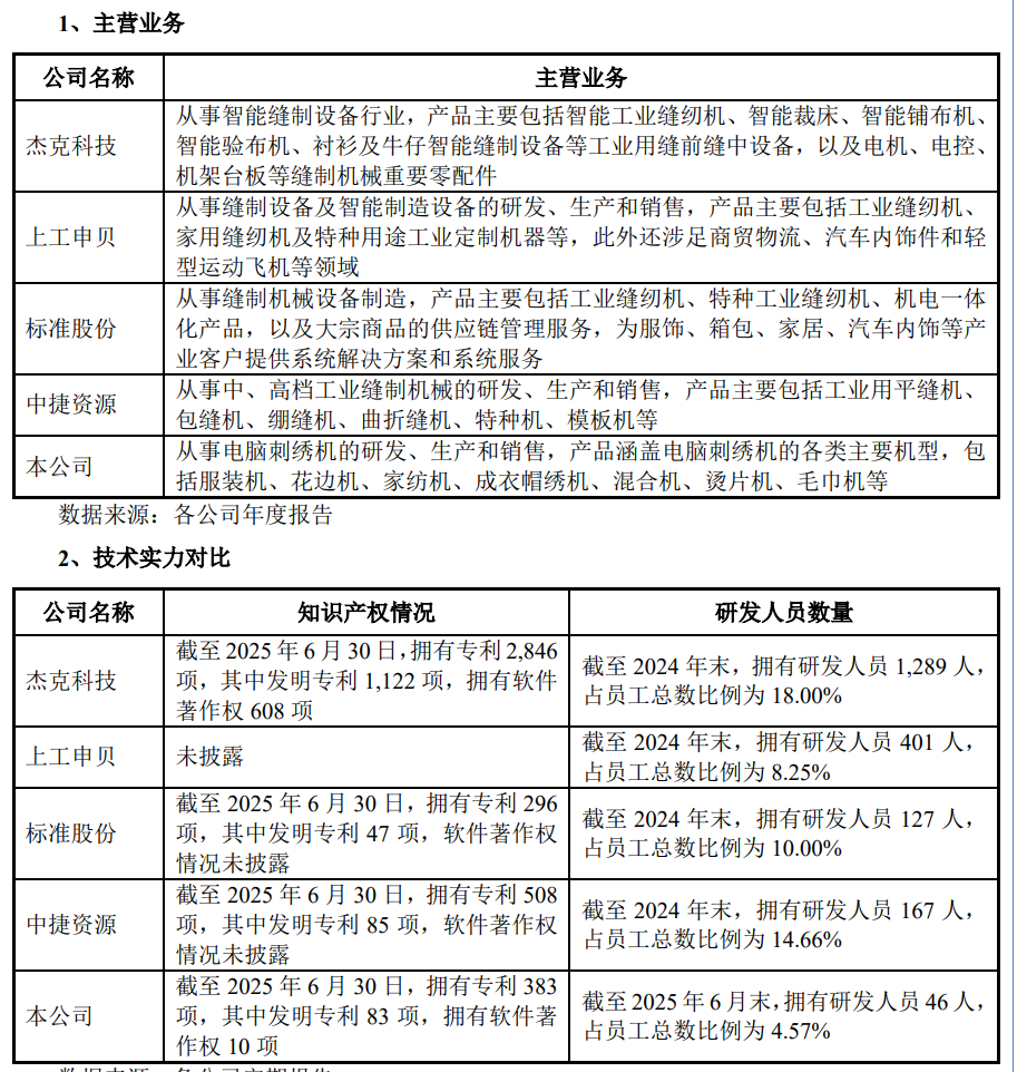 公司研发费用主要为原材料和职工薪酬,两者合计占研发费用的比例分别为91.58%、92.62%、93.46%和94.68%,2022-2024年,公司研发费用率与上工申贝、中捷资源相近,2025年1-6月因公司营业收入增长较快导致研发费用率有所下降。