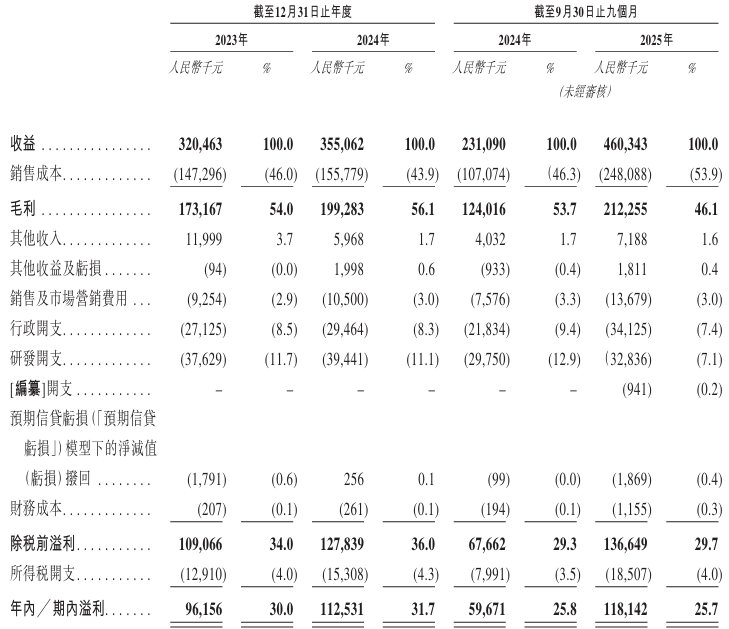 2023年度、2024年度及2025年截至9月30日止九个月,该公司收益分别约为3.20亿元、3.55亿元、4.60亿元人民币。2023年度、2024年度及2025年截至9月30日止九个月,该公司年内╱期内溢利分别约为9615.6万元、1.13亿元、1.18亿元人民币。