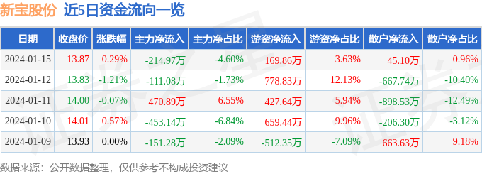 股票行情快报:新宝股份(002705)1月15日主力资金净卖出214.97万元