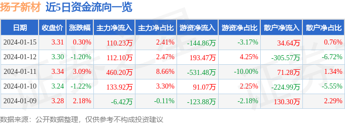1月15日的资金流向数据方面,主力资金净流入110.23万元,占总成交额2.41%,游资资金净流出144.86万元,占总成交额3.17%,散户资金净流入34.64万元,占总成交额0.76%。