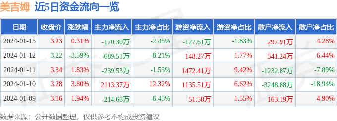 1月15日的资金流向数据方面,主力资金净流出170.3万元,占总成交额2.45%,游资资金净流出127.61万元,占总成交额1.83%,散户资金净流入297.91万元,占总成交额4.28%。