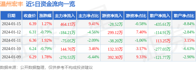 股票行情快报:温州宏丰(300283)1月15日主力资金净买入464.13万元