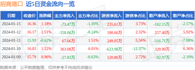 股票行情快报:招商港口(001872)1月15日主力资金净卖出73.47万元