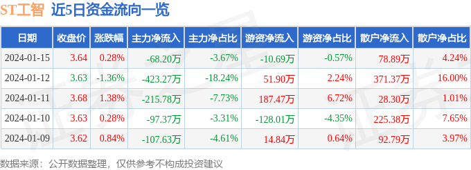 股票行情快报:ST工智(000584)1月15日主力资金净卖出68.20万元