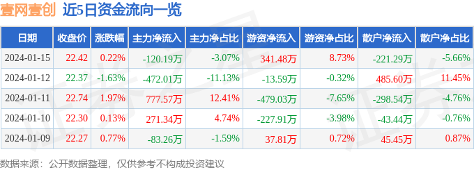 1月15日的资金流向数据方面,主力资金净流出120.19万元,占总成交额3.07%,游资资金净流入341.48万元,占总成交额8.73%,散户资金净流出221.29万元,占总成交额5.66%。