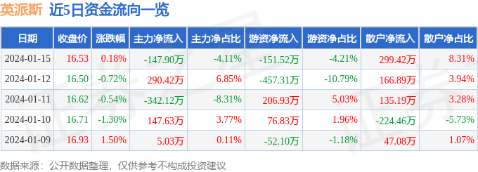 股票行情快报:英派斯(002899)1月15日主力资金净卖出147.90万元