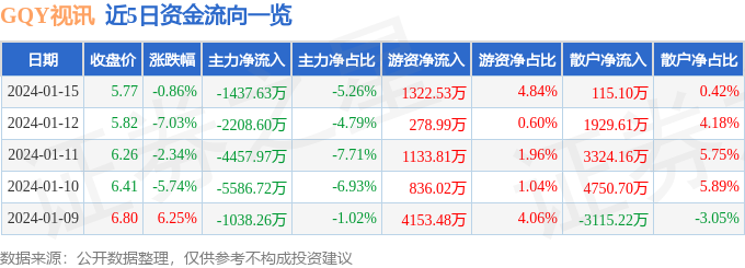财经消息,截至2024年1月15日收盘,GQY视讯(300076)报收于5.77元,下跌0.86%,换手率11.07%,成交量46.94万手,成交额2.73亿元。