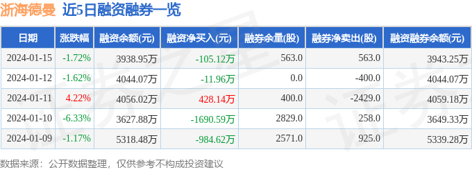 浙海德曼融资融券信息显示,融资方面,当日融资买入77.08万元,融资偿还182.2万元,融资净偿还105.12万元。融券方面,融券卖出563.0股,融券偿还0.0股,融券余量563.0股,融券余额4.3万元。融资融券余额3943.25万元。近5日融资融券数据一览见下表: