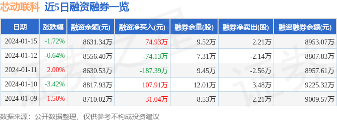 芯动联科融资融券信息显示,融资方面,当日融资买入410.63万元,融资偿还335.7万元,融资净买入74.93万元。融券方面,融券卖出3.83万股,融券偿还1.62万股,融券余量9.52万股,融券余额321.73万元。融资融券余额8953.07万元。近5日融资融券数据一览见下表: