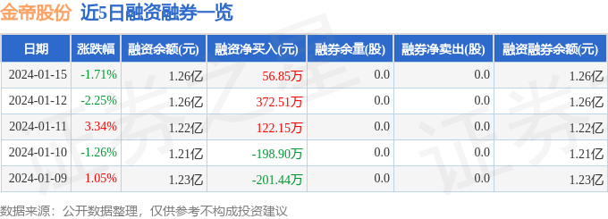 金帝股份融资融券信息显示,融资方面,当日融资买入547.81万元,融资偿还490.97万元,融资净买入56.85万元,连续3日净买入累计551.51万元。融券方面,融券卖出0.0股,融券偿还0.0股,融券余量0.0股,融券余额0.0万元。融资融券余额1.26亿元。近5日融资融券数据一览见下表: