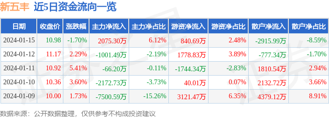 新五丰(600975)1月15日主力资金净买入2075.30万元