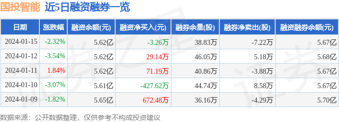 国投智能融资融券信息显示,融资方面,当日融资买入1178.57万元,融资偿还1181.83万元,融资净偿还3.26万元。融券方面,融券卖出11.48万股,融券偿还18.7万股,融券余量38.83万股,融券余额506.28万元。融资融券余额5.67亿元。近5日融资融券数据一览见下表: