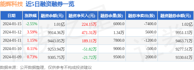 能辉科技融资融券信息显示,融资方面,当日融资买入864.14万元,融资偿还639.99万元,融资净买入224.15万元,连续3日净买入累计884.57万元。融券方面,融券卖出1100.0股,融券偿还8500.0股,融券余量6000.0股,融券余额16.04万元。融资融券余额1.02亿元。近5日融资融券数据一览见下表: