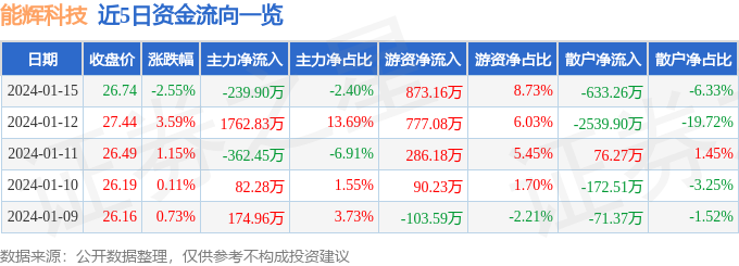 能辉科技(301046)1月15日主力资金净卖出239.90万元