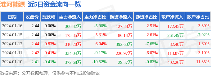 财经消息,截至2024年1月16日收盘,淮河能源(600575)报收于2.44元,上涨0.0%,换手率0.54%,成交量20.9万手,成交额5087.57万元。