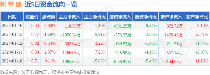 财经消息,截至2024年1月16日收盘,新 希 望(000876)报收于8.84元,上涨0.8%,换手率0.27%,成交量12.18万手,成交额1.07亿元。