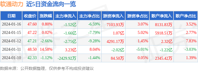 股票行情快报:软通动力(301236)1月16日主力资金净卖出1.52亿元