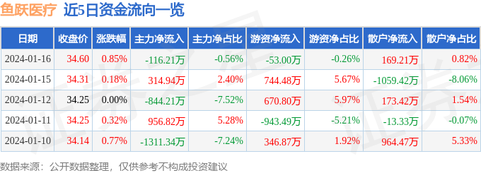 财经消息,截至2024年1月16日收盘,鱼跃医疗(002223)报收于34.6元,上涨0.85%,换手率0.64%,成交量5.99万手,成交额2.07亿元。