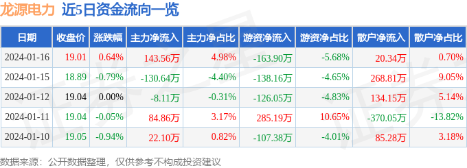 股票行情快报:龙源电力(001289)1月16日主力资金净买入143.56万元