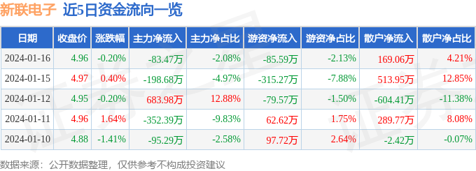 股票行情快报:新联电子(002546)1月16日主力资金净卖出83.47万元