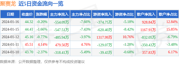 股票行情快报:聚赛龙(301131)1月16日主力资金净卖出554.09万元