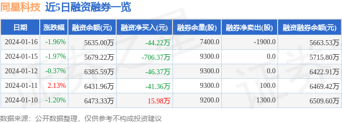 同星科技融资融券信息显示,融资方面,当日融资买入137.49万元,融资偿还181.71万元,融资净偿还44.22万元。融券方面,融券卖出2700.0股,融券偿还4600.0股,融券余量7400.0股,融券余额28.53万元。融资融券余额5663.53万元。近5日融资融券数据一览见下表: