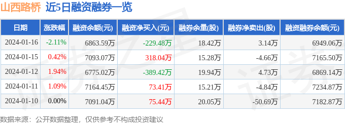 山西路桥融资融券信息显示,融资方面,当日融资买入256.81万元,融资偿还486.29万元,融资净偿还229.48万元。融券方面,融券卖出4.48万股,融券偿还1.34万股,融券余量18.42万股,融券余额85.47万元。融资融券余额6949.06万元。近5日融资融券数据一览见下表:
