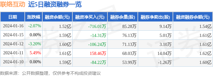 联络互动融资融券信息显示,融资方面,当日融资买入112.48万元,融资偿还828.49万元,融资净偿还716.01万元。融券方面,融券卖出17.36万股,融券偿还8.22万股,融券余量85.28万股,融券余额202.1万元。融资融券余额1.54亿元。近5日融资融券数据一览见下表: