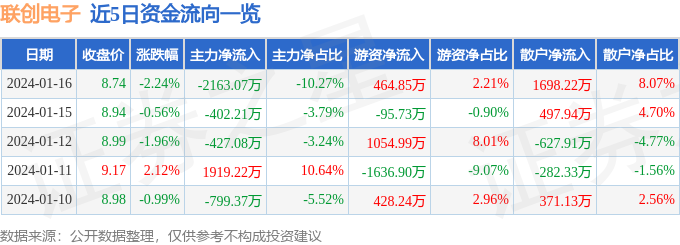 联创电子(002036)1月16日主力资金净卖出2163.07万元