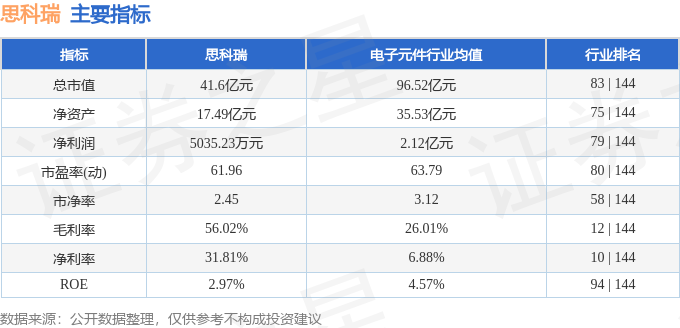 思科瑞2023年三季报显示,公司主营收入1.57亿元,同比下降21.79%;归母净利润5035.23万元,同比下降39.1%;扣非净利润4679.5万元,同比下降40.93%;其中2023年第三季度,公司单季度主营收入4678.37万元,同比下降34.13%;单季度归母净利润1141.15万元,同比下降56.28%;单季度扣非净利润1096.79万元,同比下降55.69%;负债率5.15%,投资收益1198.41万元,财务费用-259.43万元,毛利率56.02%。思科瑞(688053)主营业务:军用电子元器件可靠性检测服务。