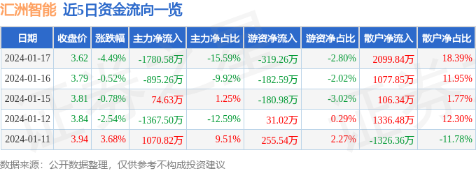 财经消息,截至2024年1月17日收盘,汇洲智能(002122)报收于3.62元,下跌4.49%,换手率1.56%,成交量30.98万手,成交额1.14亿元。