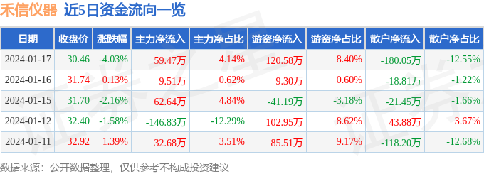 财经消息,截至2024年1月17日收盘,禾信仪器(688622)报收于30.46元,下跌4.03%,换手率1.2%,成交量4659.0手,成交额1434.83万元。