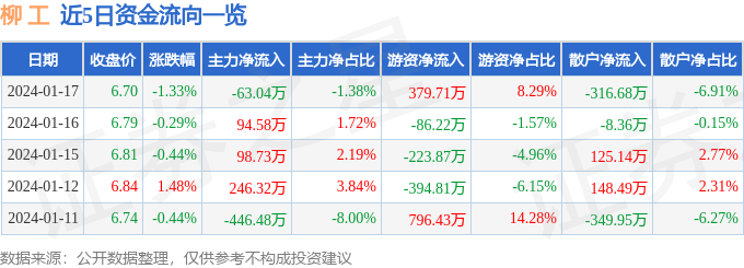 股票行情快报:柳工(000528)1月17日主力资金净卖出63.04万元