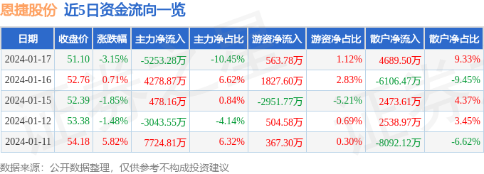 1月17日的资金流向数据方面,主力资金净流出5253.28万元,占总成交额10.45%,游资资金净流入563.78万元,占总成交额1.12%,散户资金净流入4689.5万元,占总成交额9.33%。