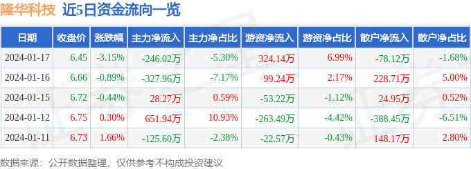 财经消息,截至2024年1月17日收盘,隆华科技(300263)报收于6.45元,下跌3.15%,换手率0.92%,成交量7.09万手,成交额4639.64万元。