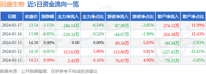 股票行情快报:回盛生物(300871)1月17日主力资金净卖出186.14万元