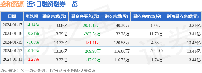 盛和资源融资融券信息显示,融资方面,当日融资买入680.15万元,融资偿还2718.27万元,融资净偿还2038.12万元。融券方面,融券卖出13.23万股,融券偿还5.21万股,融券余量140.3万股,融券余额1268.34万元。融资融券余额13.21亿元。近5日融资融券数据一览见下表: