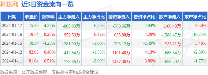 1月17日的资金流向数据方面,主力资金净流出805.83万元,占总成交额6.57%,游资资金净流出360.66万元,占总成交额2.94%,散户资金净流入1166.49万元,占总成交额9.5%。