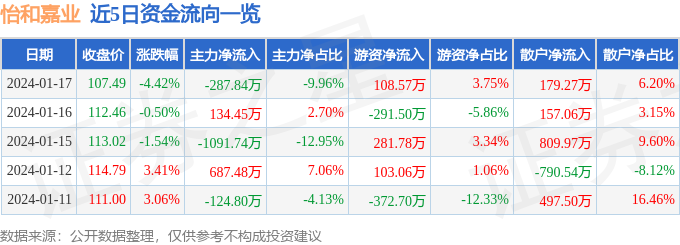 怡和嘉业(301367)1月17日主力资金净卖出287.84万元