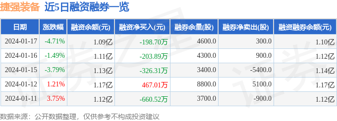 捷强装备融资融券信息显示,融资方面,当日融资买入469.23万元,融资偿还667.93万元,融资净偿还198.7万元。融券方面,融券卖出1000.0股,融券偿还700.0股,融券余量4600.0股,融券余额13.6万元。融资融券余额1.1亿元。近5日融资融券数据一览见下表: