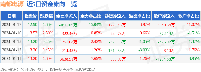 财经消息,截至2024年1月17日收盘,南都电源(300068)报收于12.9元,下跌4.66%,换手率2.92%,成交量24.18万手,成交额3.2亿元。