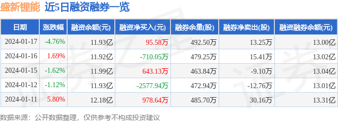 盛新锂能融资融券信息显示,融资方面,当日融资买入3827.04万元,融资偿还3731.47万元,融资净买入95.58万元。融券方面,融券卖出47.72万股,融券偿还34.47万股,融券余量492.5万股,融券余额1.07亿元。融资融券余额13.0亿元。近5日融资融券数据一览见下表: